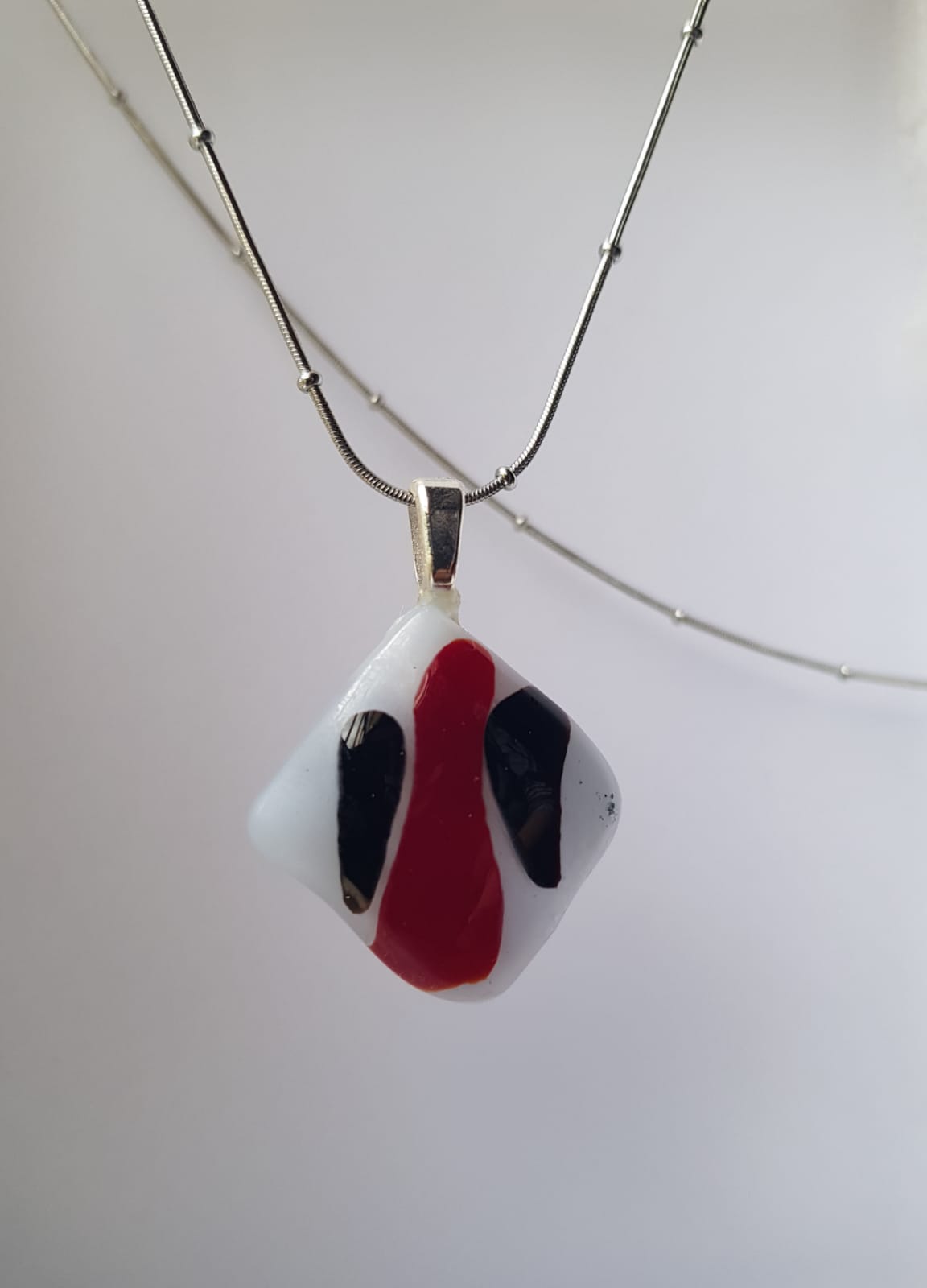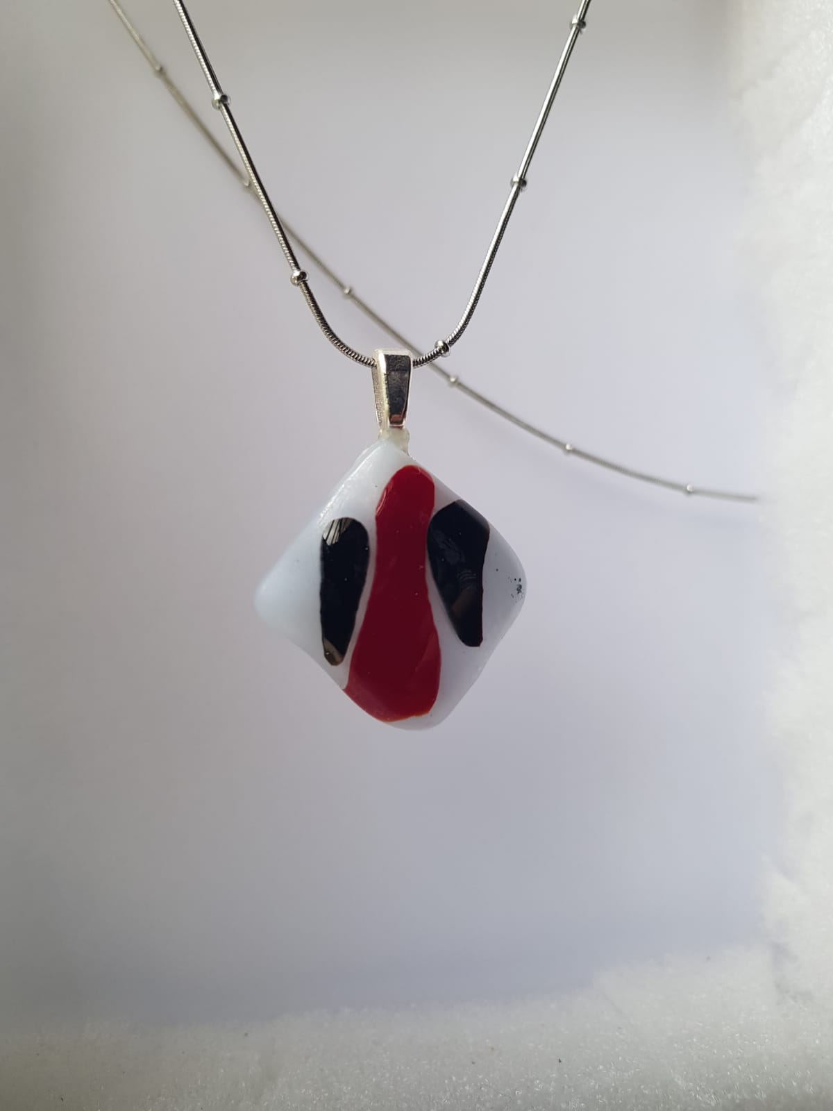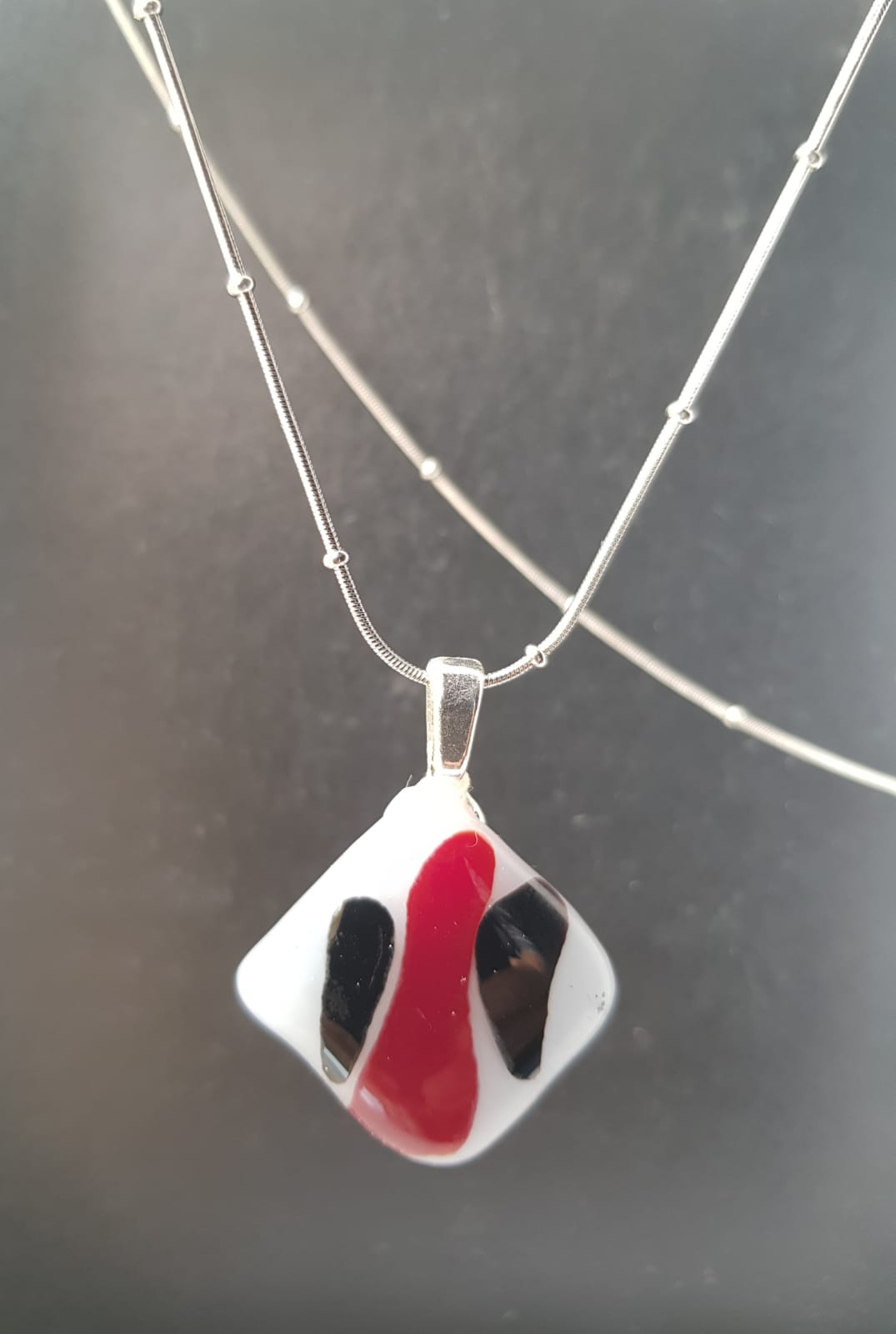 Viene con una cadenita de acero quirúrgico,que no se opaca ni ennegrece.