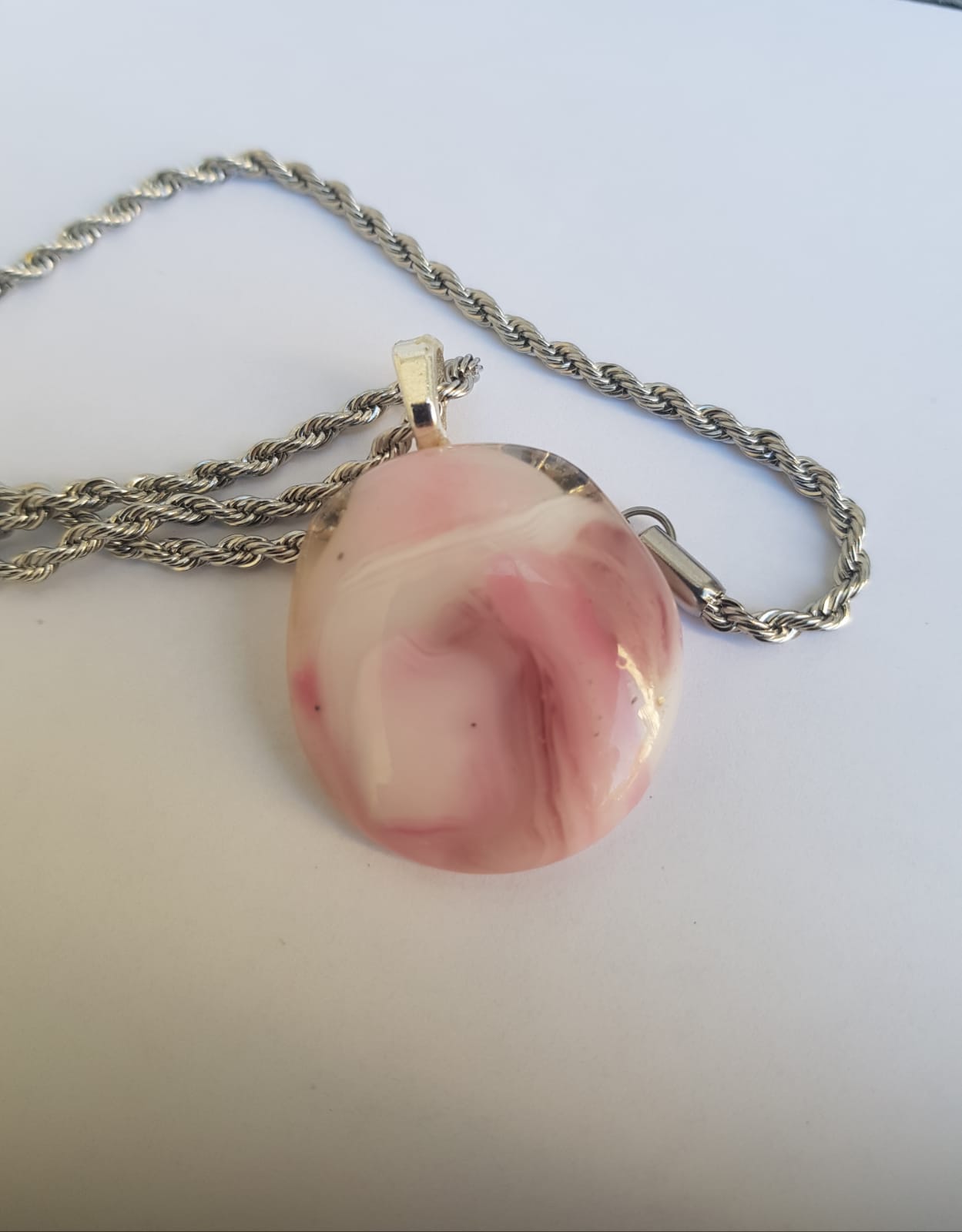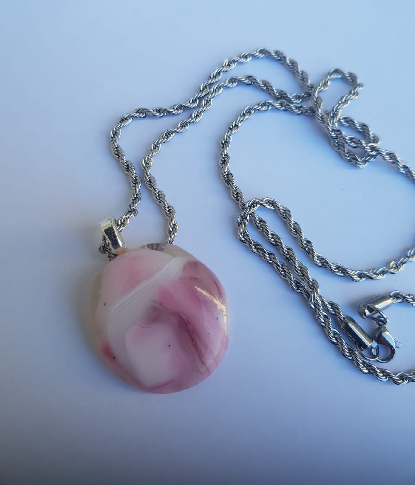Viene con una cadenita de acero quirúrgico,que no se opaca ni ennegrece.