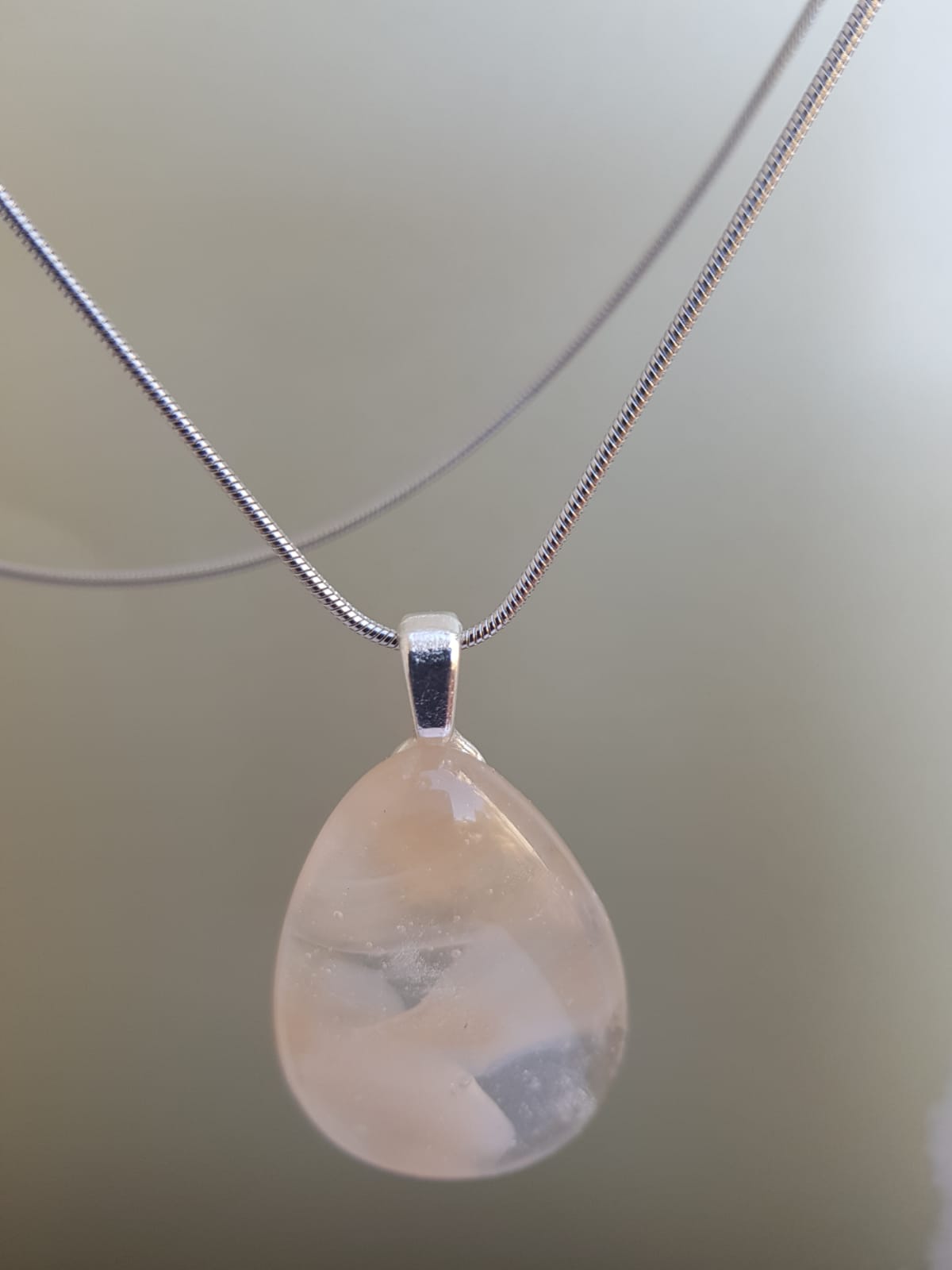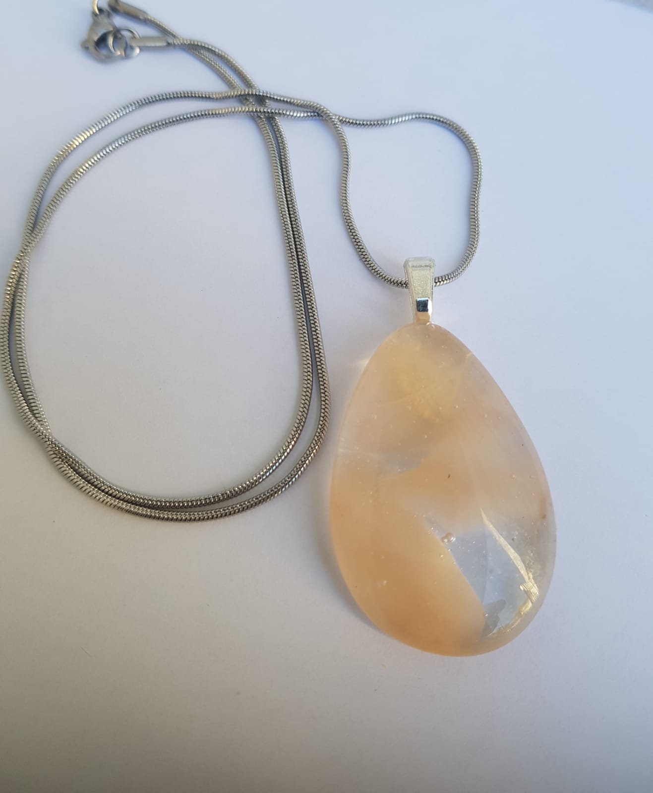 Viene con una cadenita de acero quirúrgico,que no se opaca ni ennegrece.
