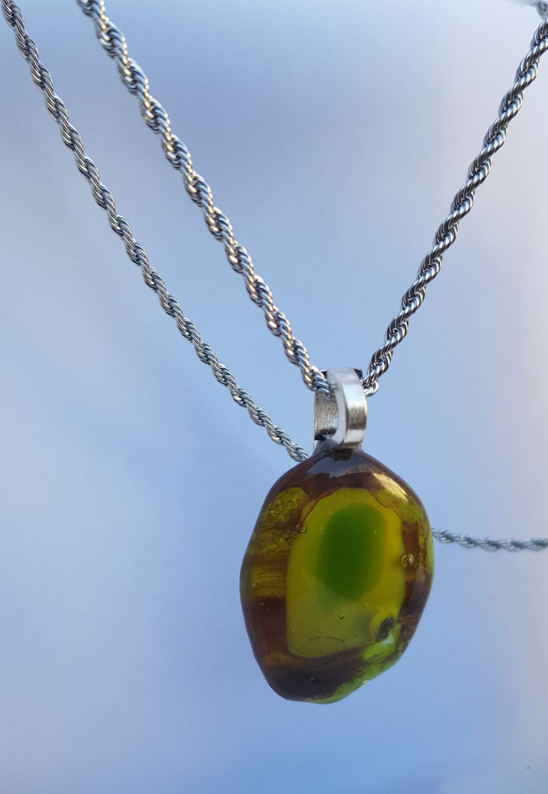Viene con una cadenita de acero quirúrgico,que no se opaca ni ennegrece.