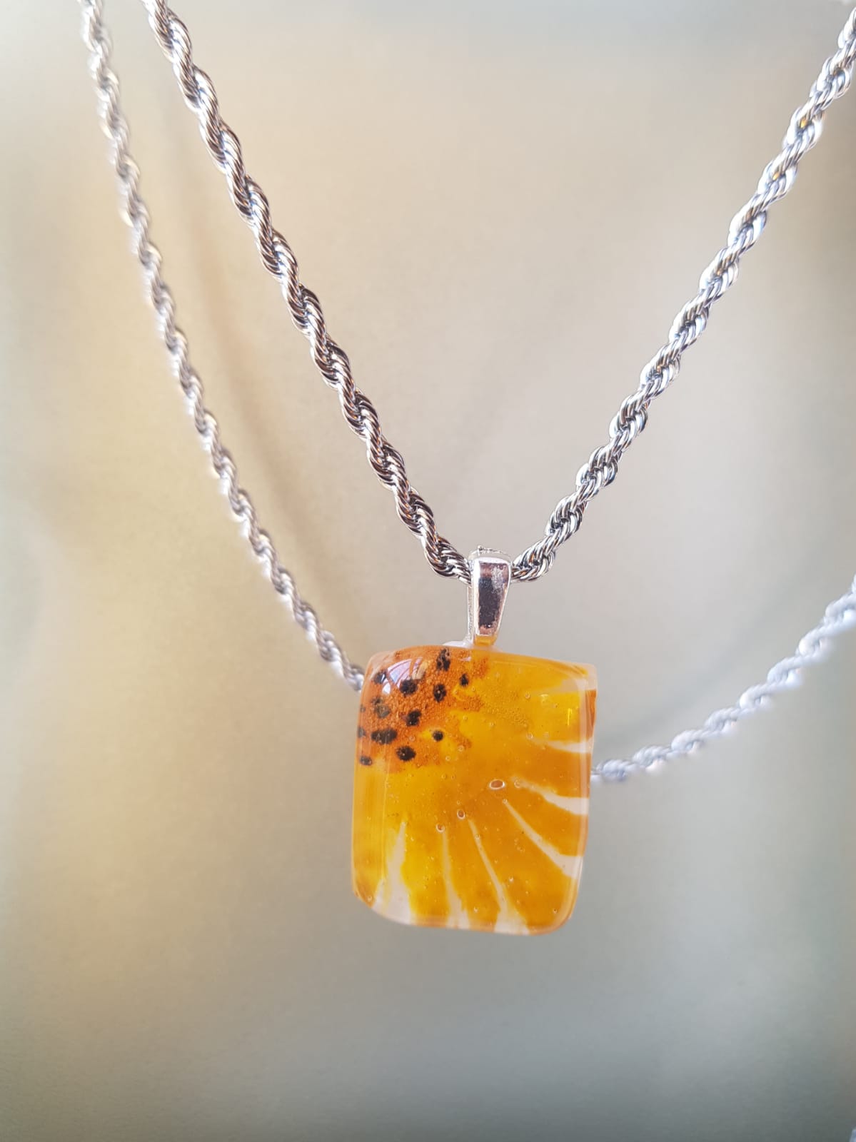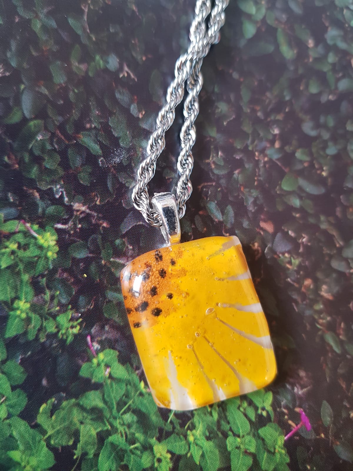 Hermosa margarita pintada a mano y fundida entre 2 capas de vidrio llevadas a altas temperaturas,lo que asegura la inalterabilidad de los colores a través del tiempo.