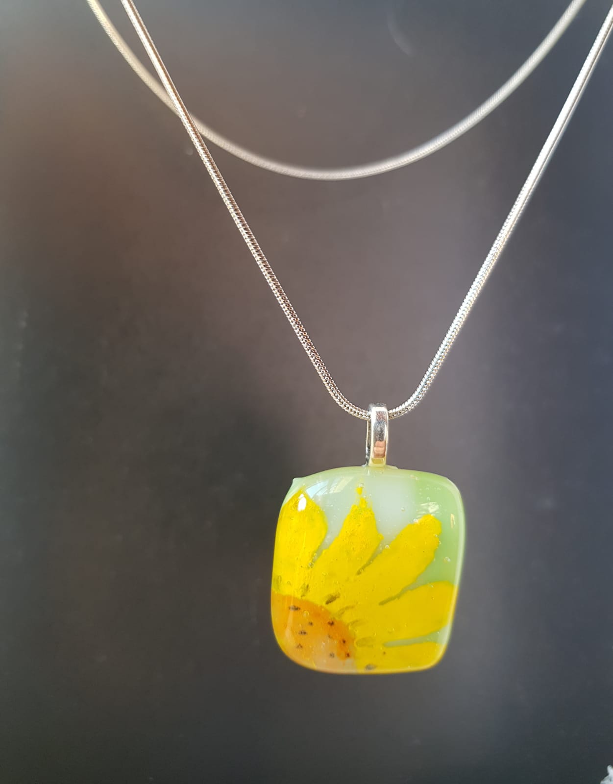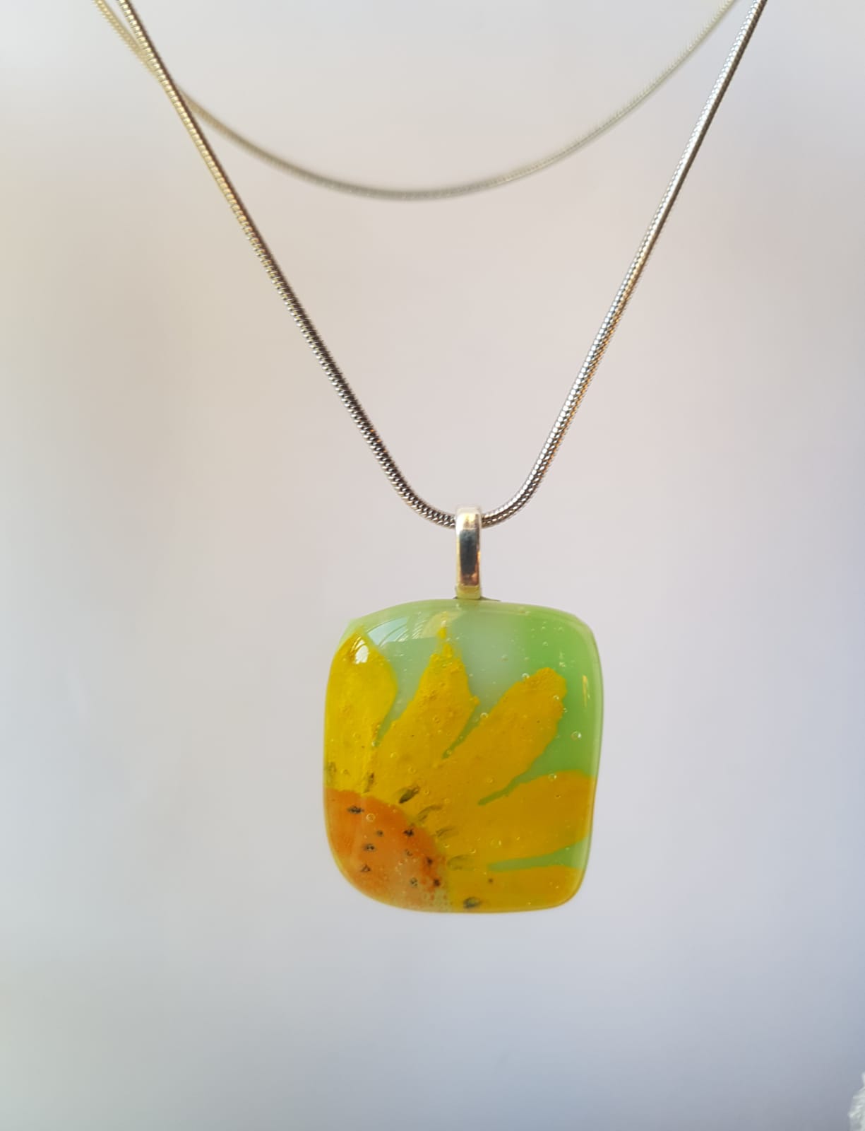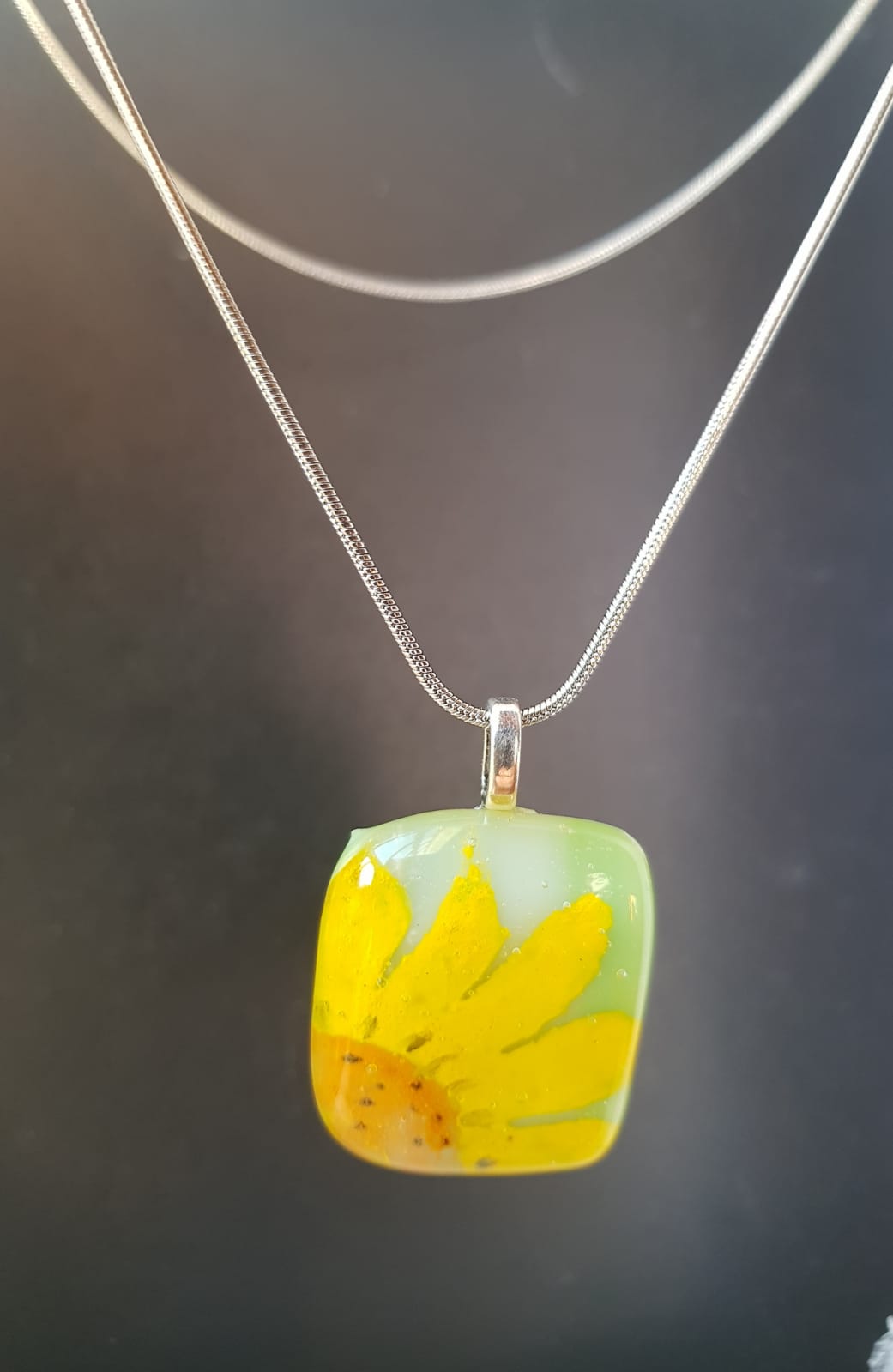 Este girasol está pintado sobre vidrio verde y cubierto con otro vidrio transparente,llevado luego a horno a altas temperaturas,lo que garantiza que el color no se altere con el paso del tiempo.