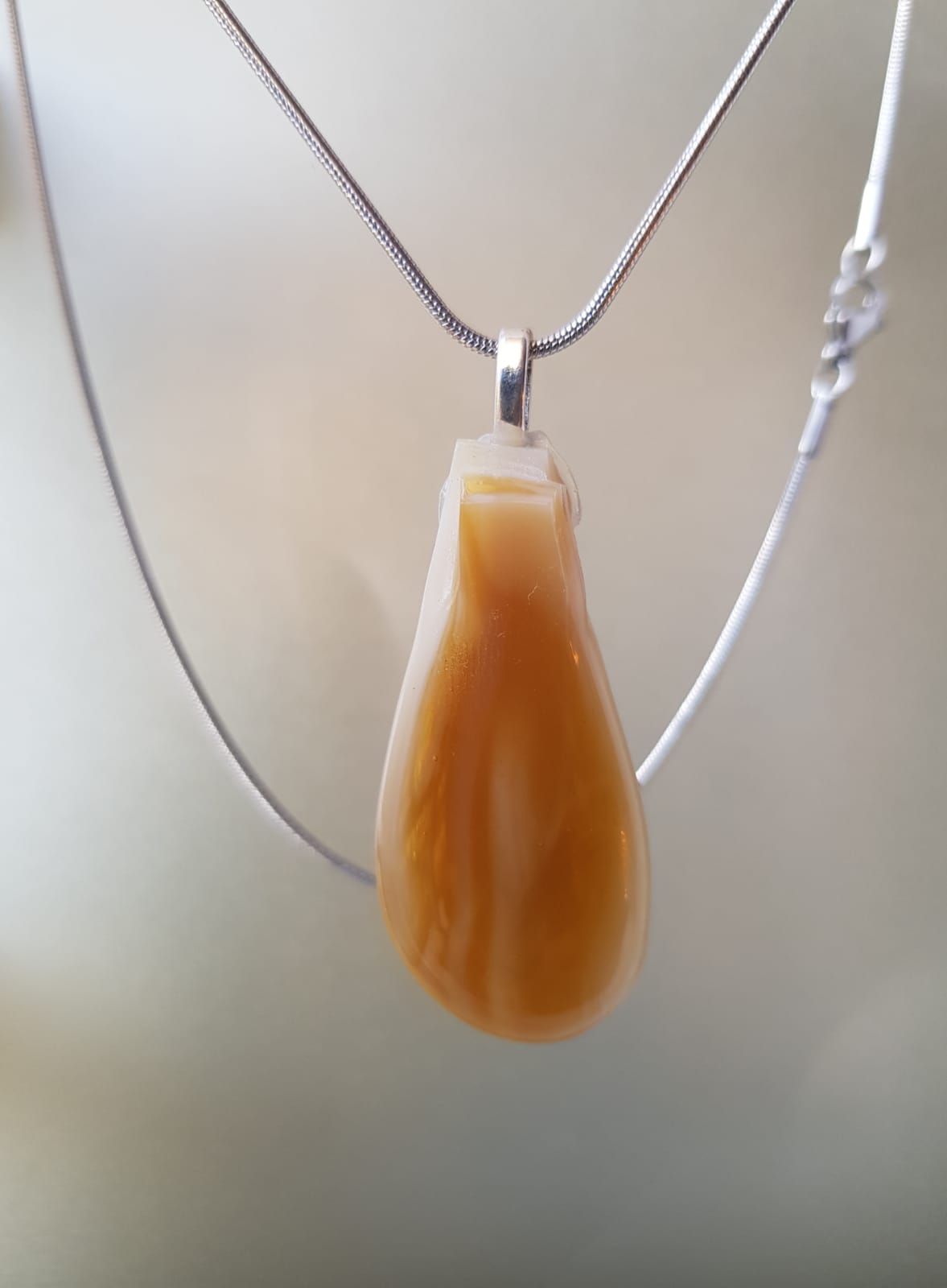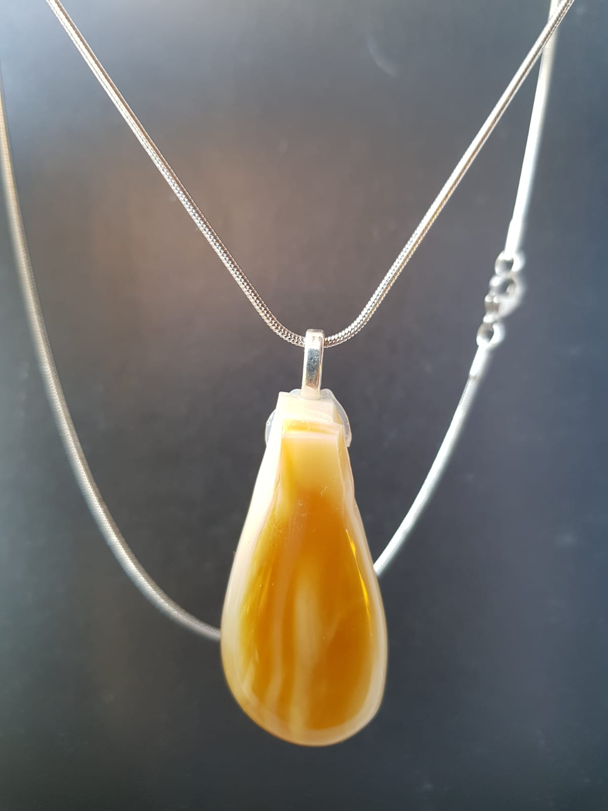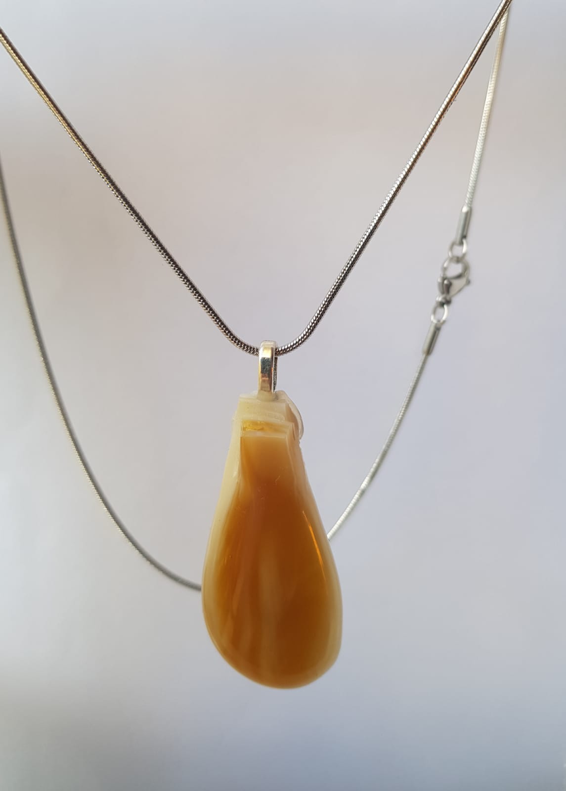 Viene con una cadenita de acero quirúrgico,que no se opaca ni ennegrece.