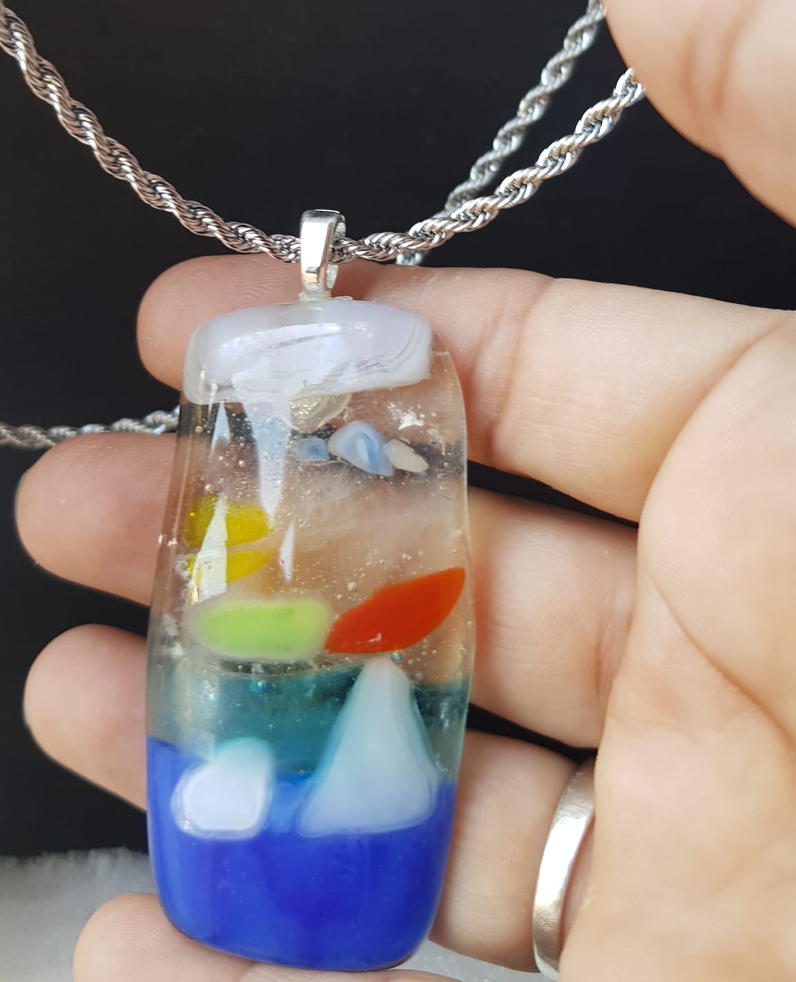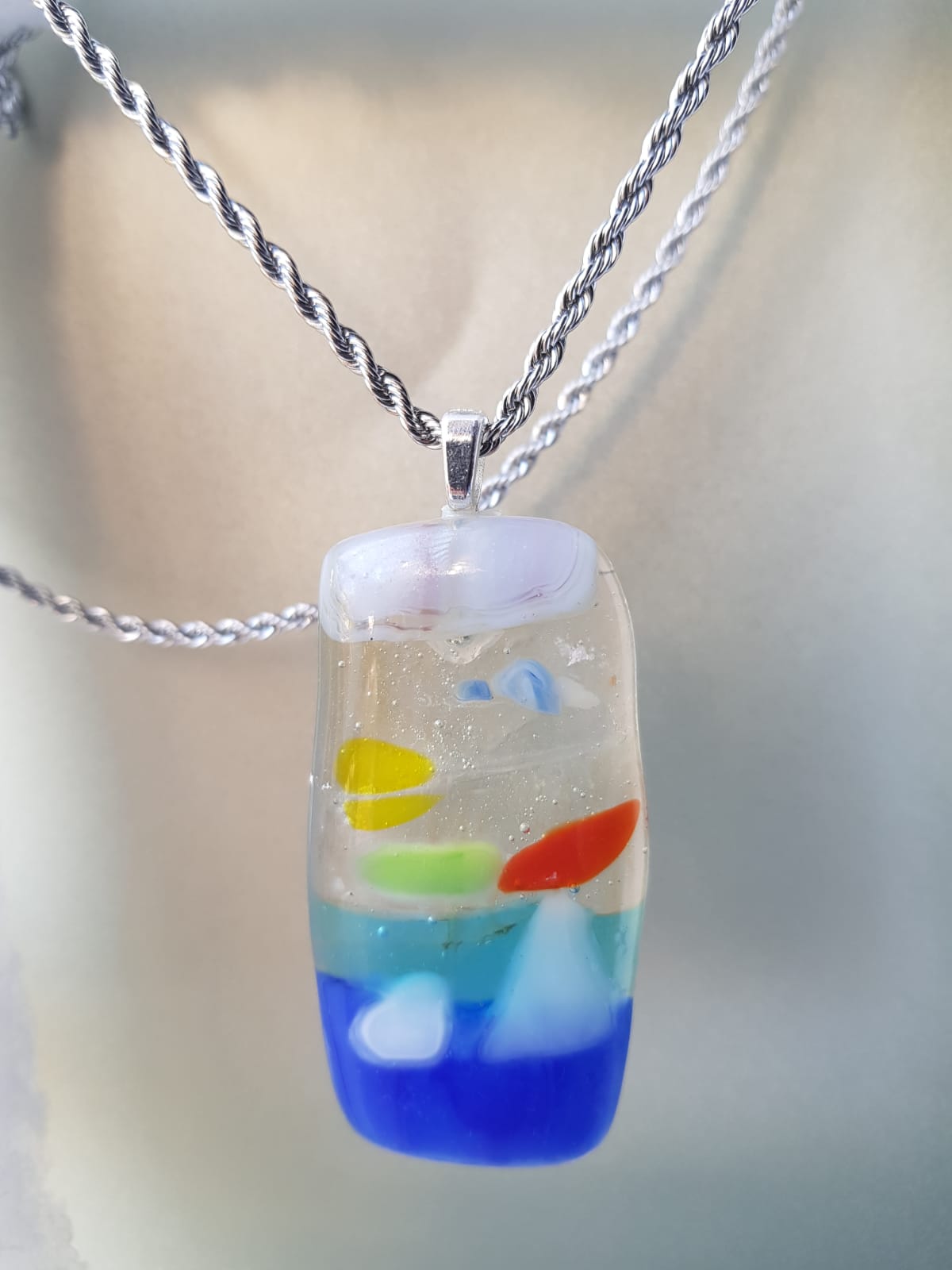 En este diseño se intentó,a través de vidrios de colores recortados y fusionados ,recrear un paisaje marino de mucha actividad, 2 veleros surcando el mar y varios sky surf en el cielo.