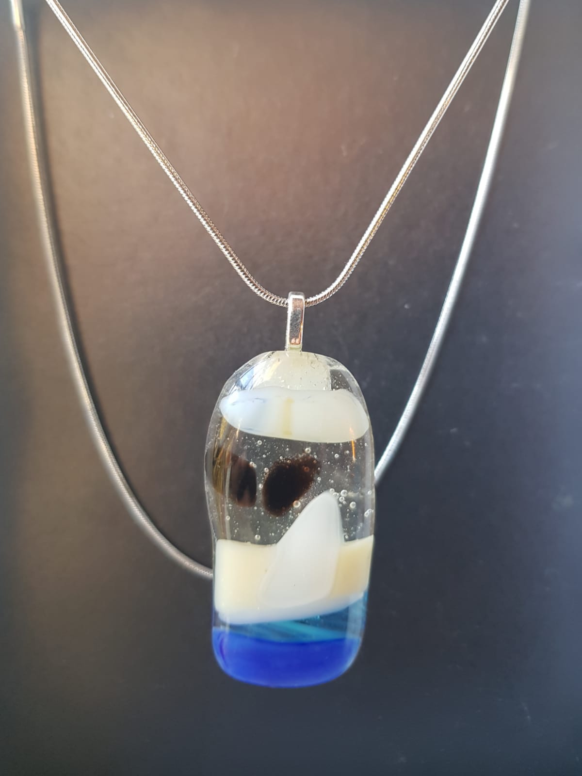 Este diseño representa un paisaje de verano surcado por nubes negras en cielo traslúcido,con velero blanco cerca de la costa.