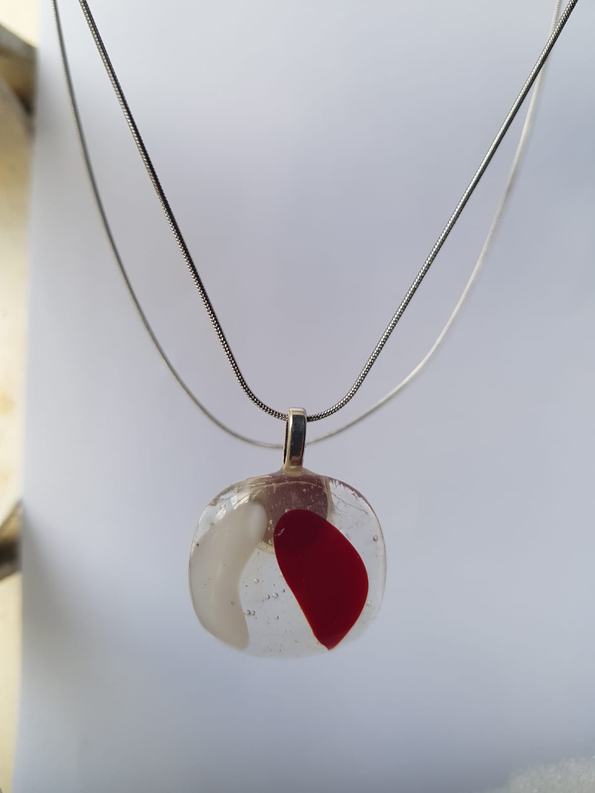 Diseño redondo vidrio transparente con toques rojo y blanco fusionados en él.