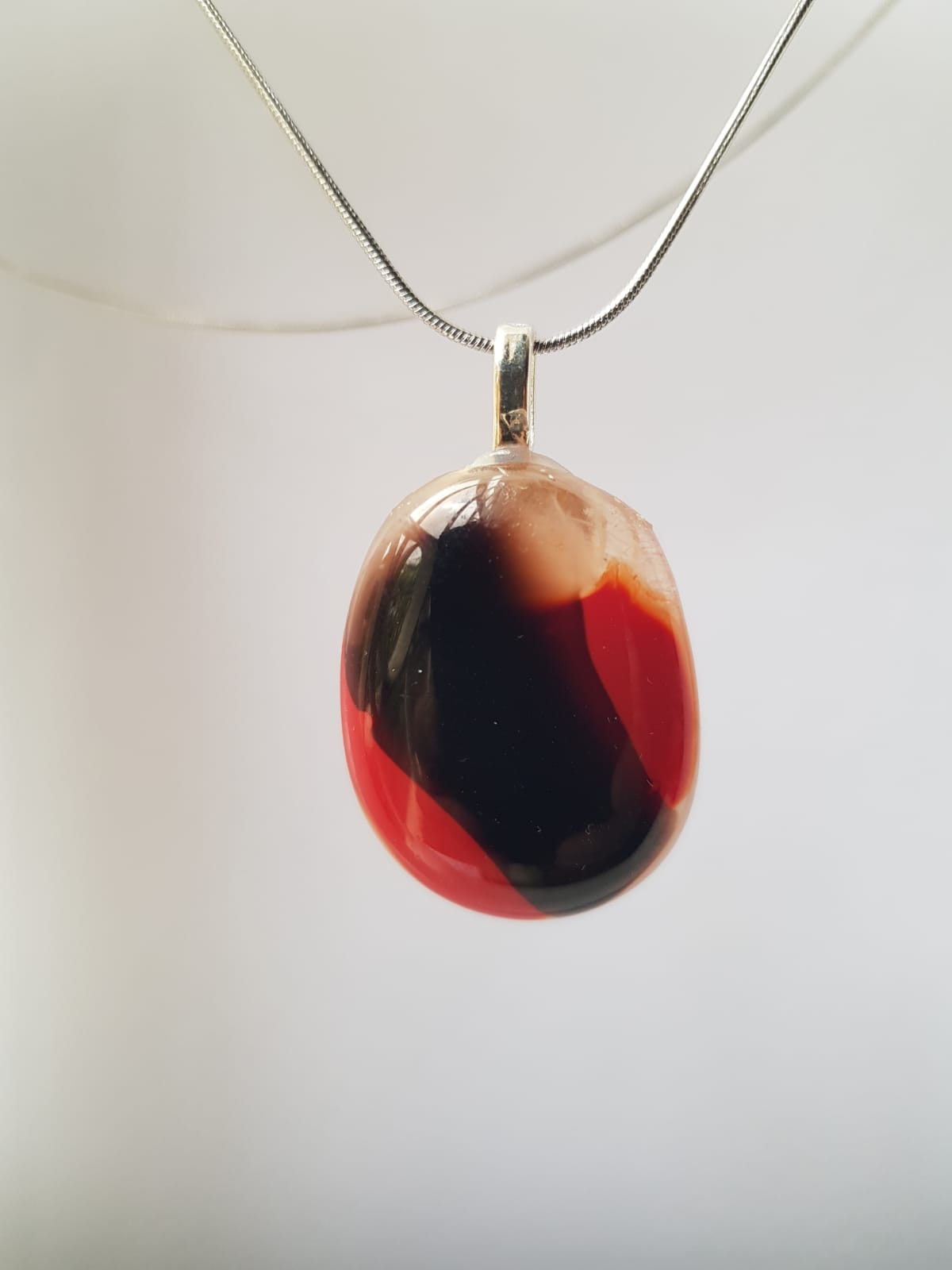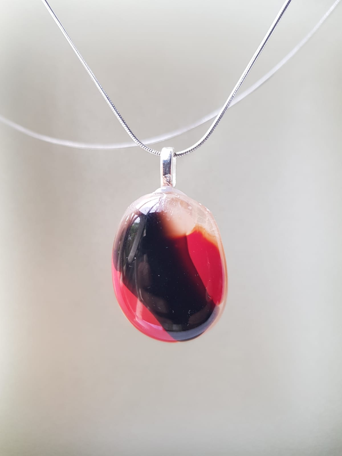 Como cada mujer,cada pieza es única por la forma en que se funden,caprichosamente los vidrios. Óvalo rojo con franja negra.