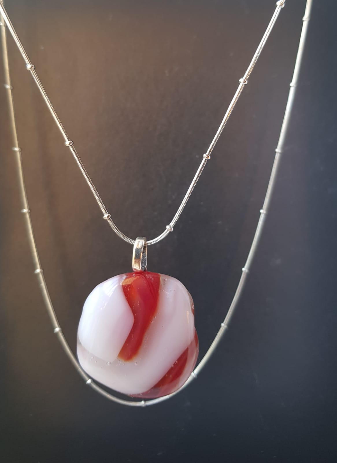 Viene con una cadenita de acero quirúrgico,que no se opaca ni ennegrece.