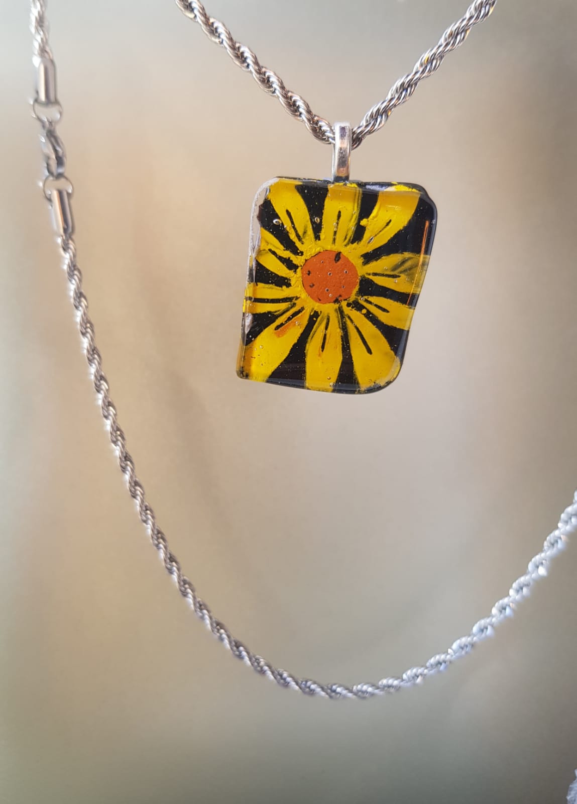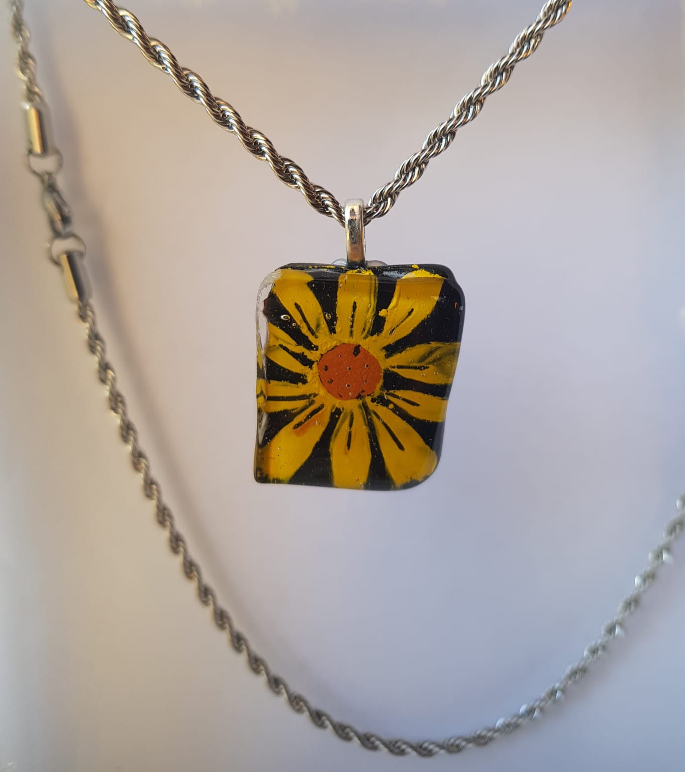 Margarita amarilla pintada sobre vidrio negro y cubierta traslúcida,llevada a altas temperaturas,donde las capas se fusionan sellando así la pintura.